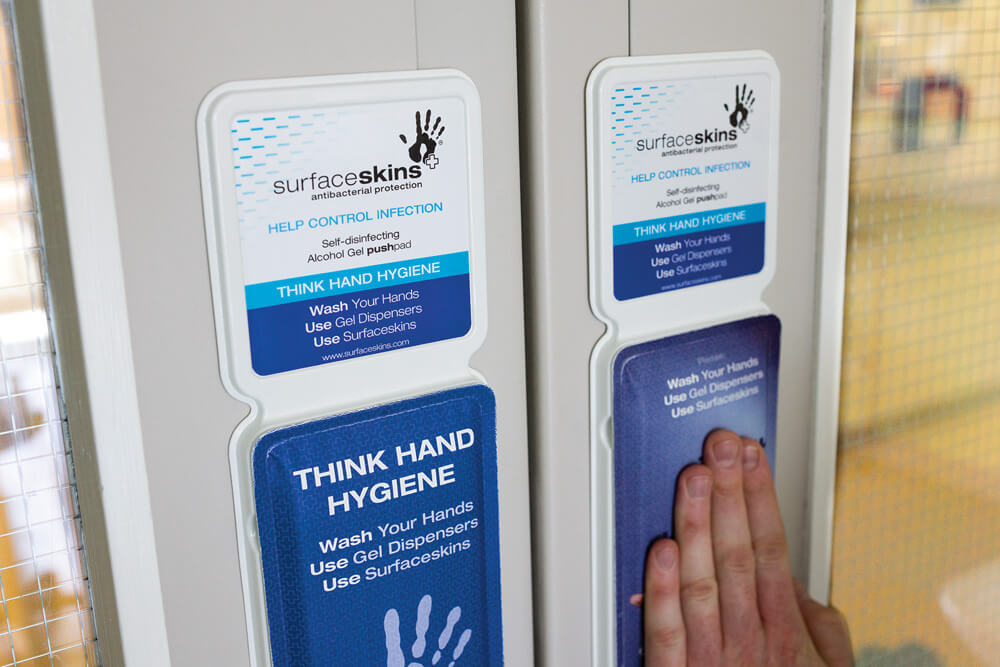 Wir unterstützen zurzeit die britische Start-up-Firma Surfaceskins bei der Einführung einer patentierten Weltneuheit in der Hand-Hygiene. Es handelt sich um ein komplementäres Produkt zum Alkohol-Handgel, welches die Kreuzkontamination über Berührung von Türoberflächen senkt.